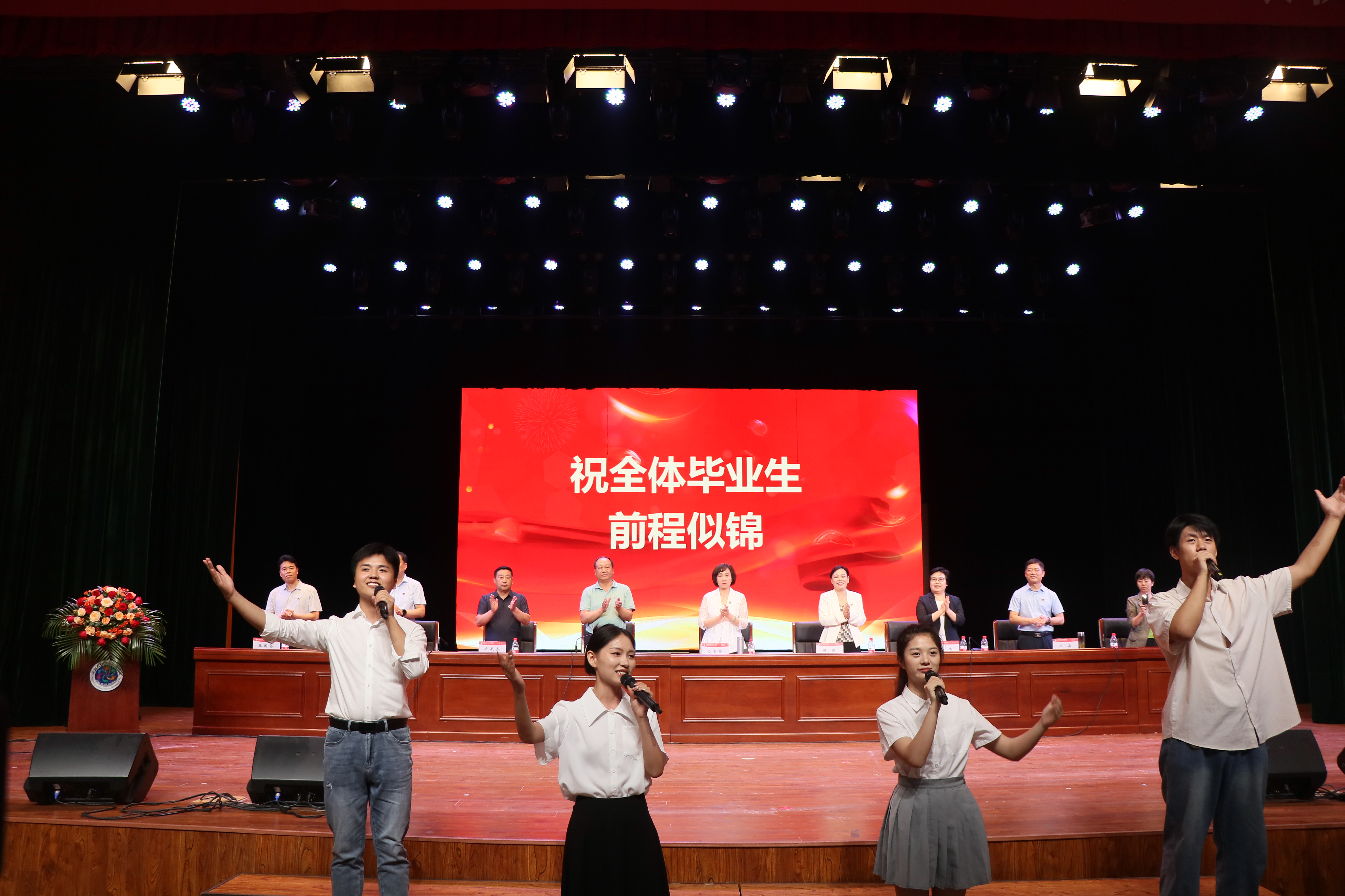 校领导为毕业代表颁发毕业证书,为优秀毕业生代表颁奖,并为当天过生日的6位同学送上一份生日关爱与祝福。