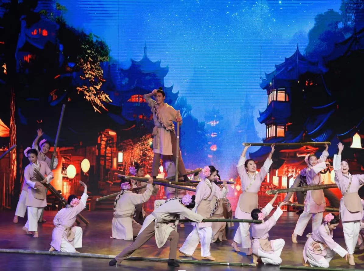 大型实践教学原创歌舞剧《大河·城摞城》共分为“大梁· 兴亡”“东京·平仄”“开封·来去”“新城·古今”四个篇章。通过如诗如梦、多姿多彩、绚烂华丽的音舞创作表演,阐释中华文明连续性、统一性、创新性、包容性的特点,给人丰富奇妙的感官享受,深厚美好的心灵滋润。